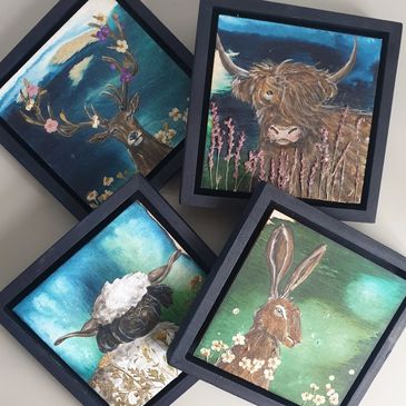 My miniature wood frame art pieces feature vibrant, hand-painted characters inspired by nature, each crafted with care and personality. These small artworks are designed for wall hanging or shelf display, adding a charming touch to any space. Each piece is unique, so slight variations from the images shown ensure each piece is one of a kind. Hand-painted in the UK, each miniature wood panel is framed in a dark navy wood frame. Size 12cm x 12cm.